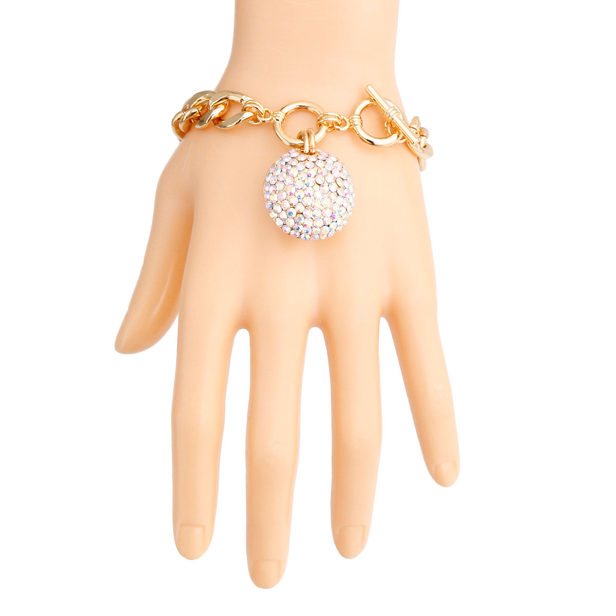 Gold Metal Toggle Chain Bracelet Featuring Aurora Borealis Pave Rhinestone Ball Charm. Charm measures 1 inch