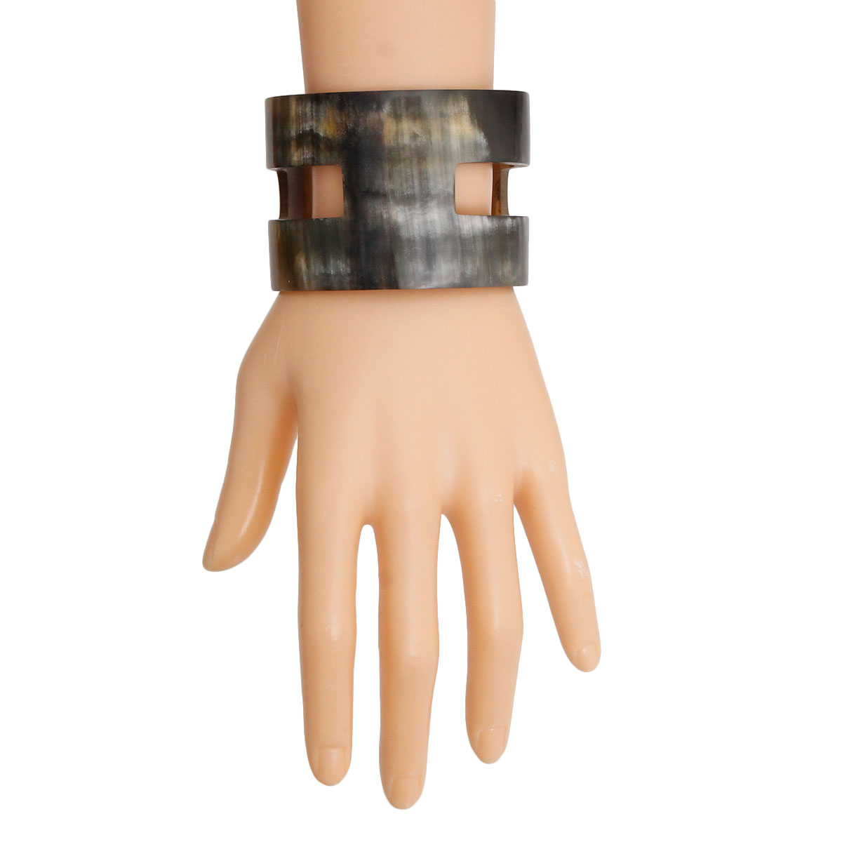 Natural Ethically Sourced Buffalo Horn Cuff Bracelet Featuring Cut Out Detail. Bracelet measures 2.15 inches long. Please allow for natural color and texture variations