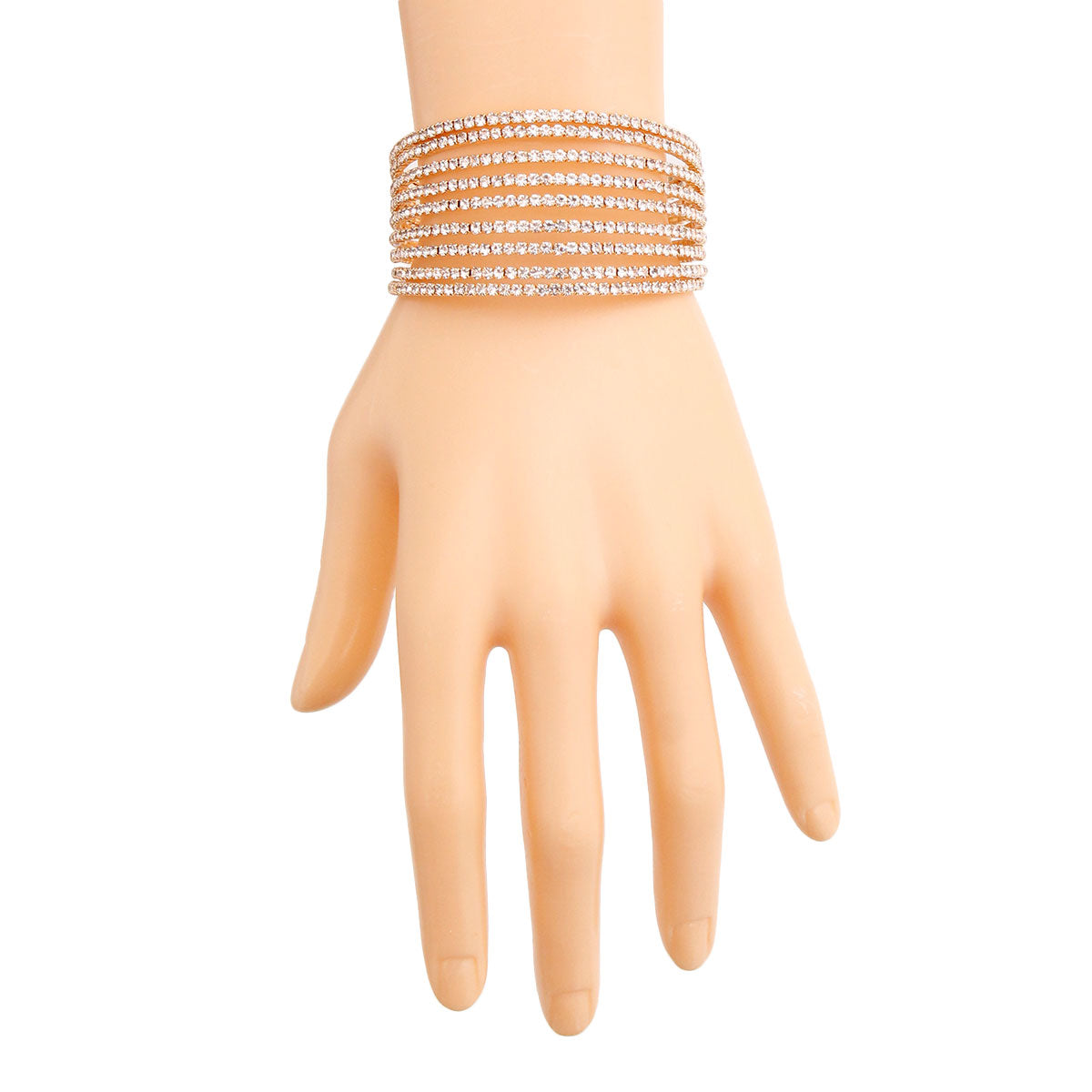 Gold Metal Wire Wrap 9 Line Bracelet Featuring Clear Rhinestone Detailing. Bracelet measures 1.25 inches wide