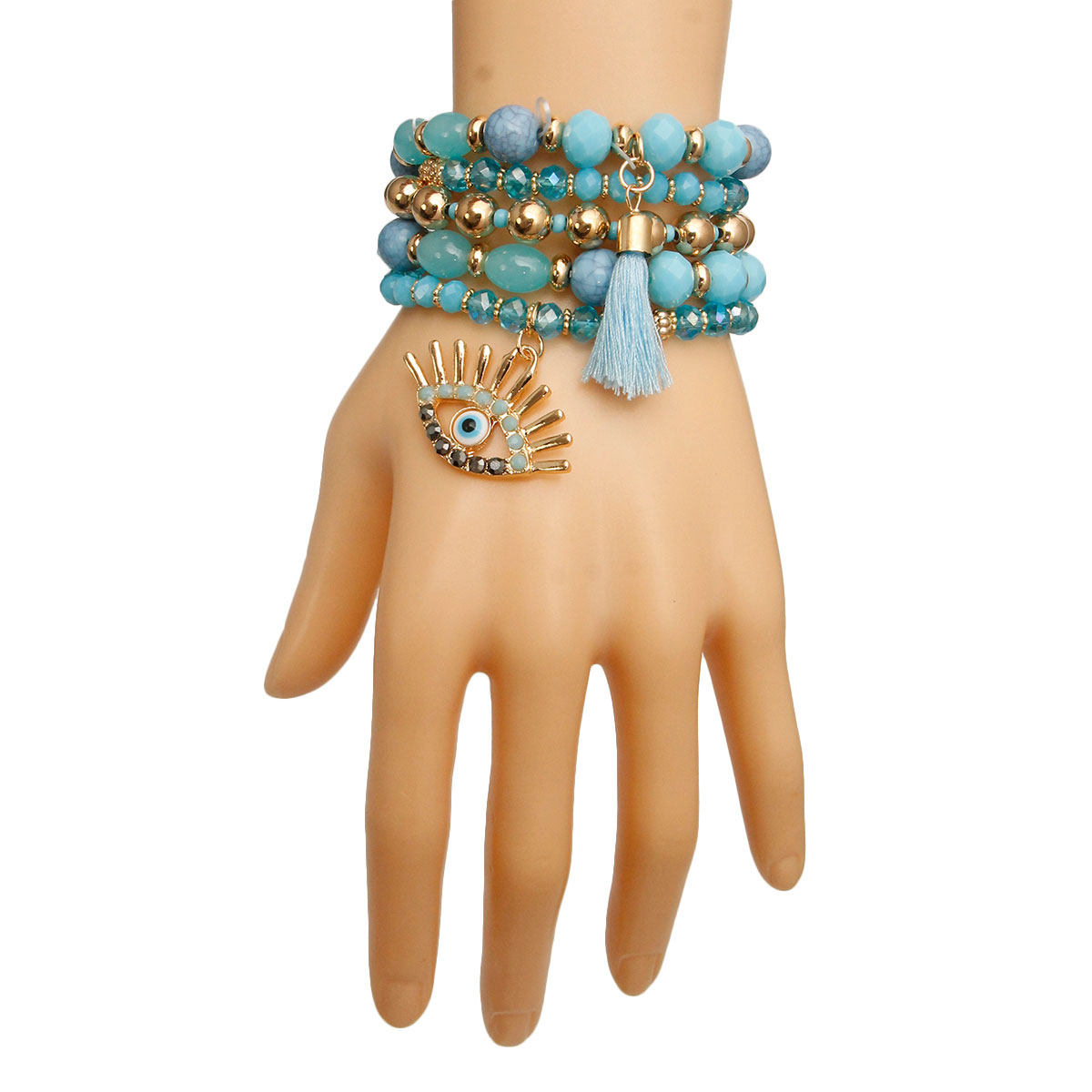 Gold with Light Blue Beads Stretch Bracelet Set Featuring Evil Eye and Hamsa Charms and Tassel. 5 Pcs Set