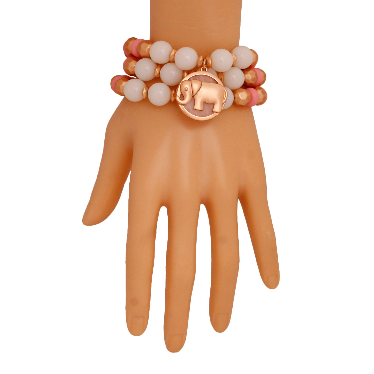 Pink and Matte Gold Bead 3 Pcs Stretch Bracelet Set Featuring White Glass Beads and Elephant Charm. Charm measures 1.15 inches