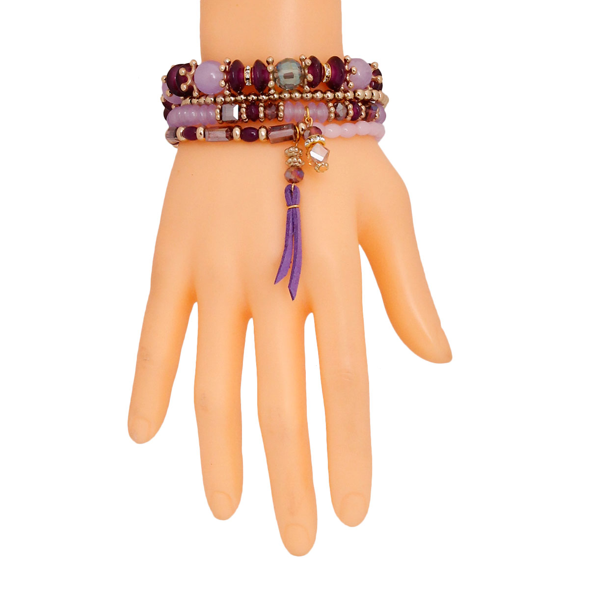 Gold and Shades of Purple Glass Beads 4 Pcs Stretch Bracelet Set Featuring Vegan Leather and Bead Drop Detail