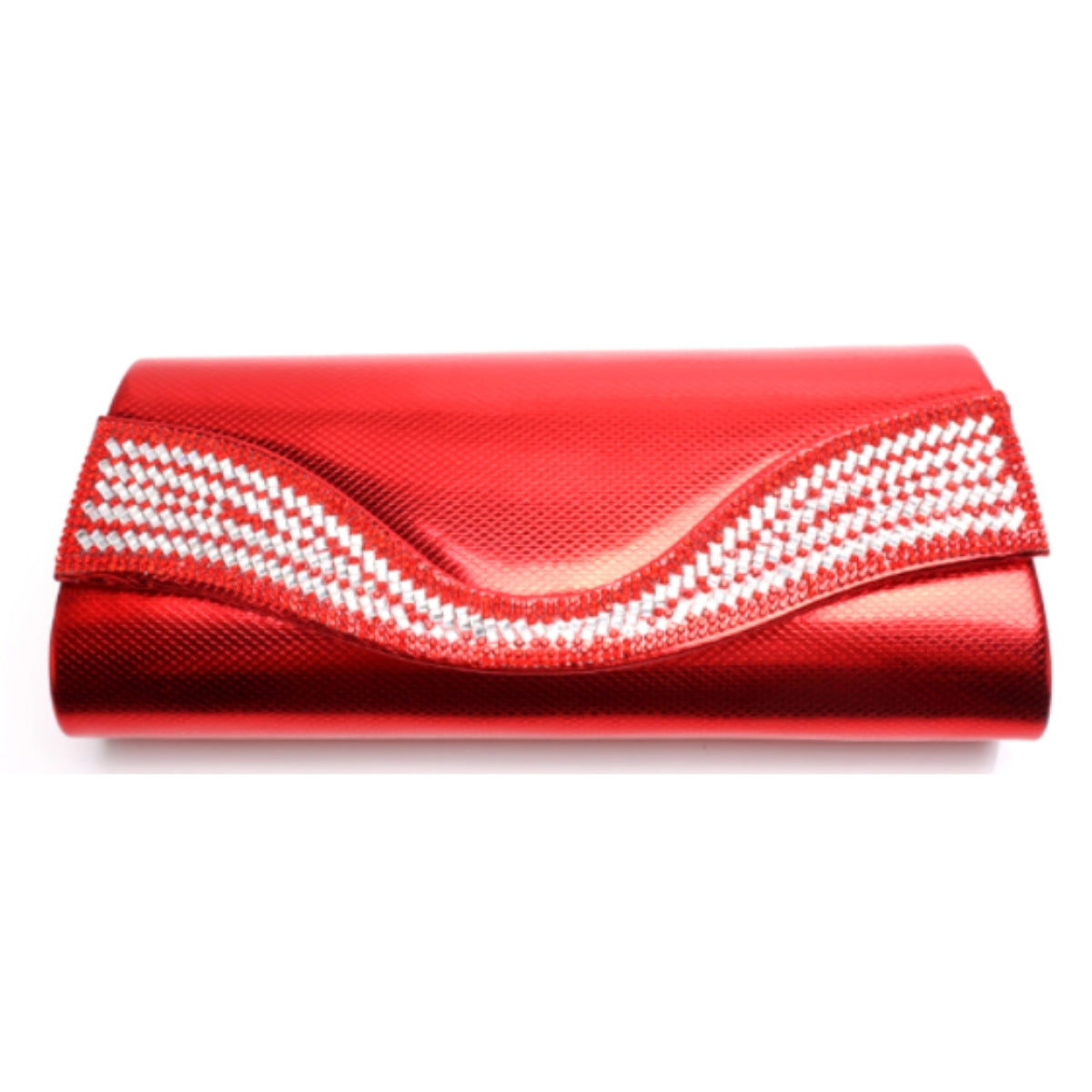Shiny Red Metallic Vegan Leather Formal Clutch Handbag Featuring Flap and Snap Envelope Style Closure with Crystal Rhinestone Detailing. Matching Shoulder Chain Included