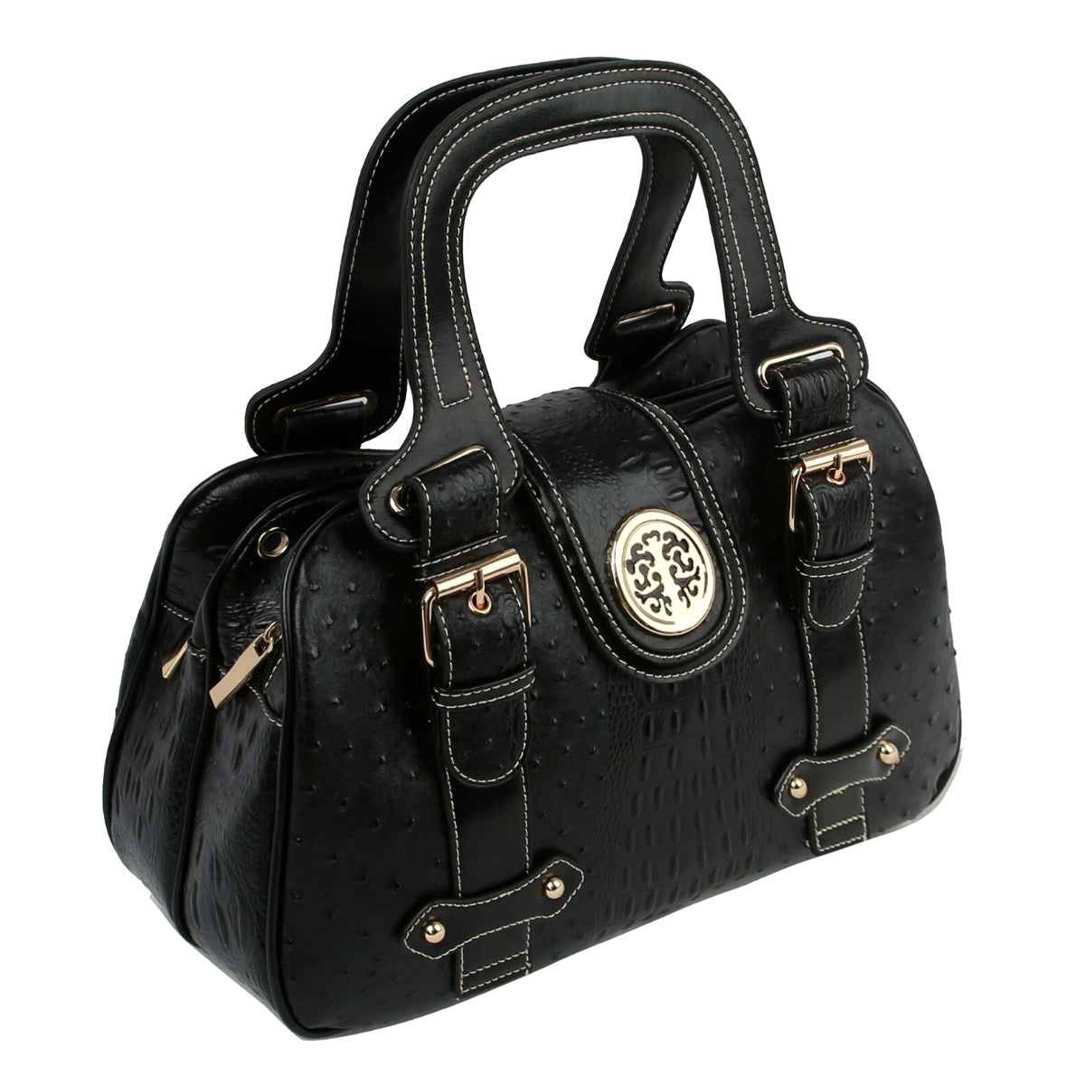 Black Ostrich Vegan Leather Satchel Handbag Featuring Buckle and Gold Filigree Detailing. Thick Black Handles with Stitch Detail. Main Zipper with Flap and Snap Closure. Divided Interior. Detachable Shoulder Strap Included