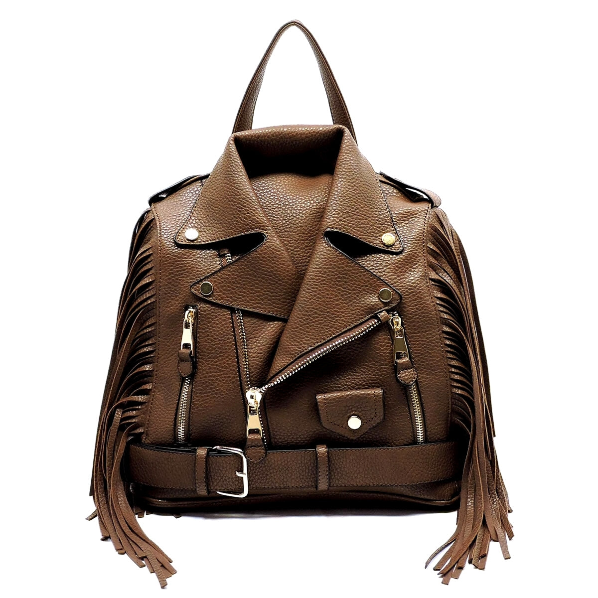 Brown Vegan Leather Moto Jacket Backpack Handbag Featuring Fringe Detail. Zipper Closure. Adjustable Shoulder Straps.