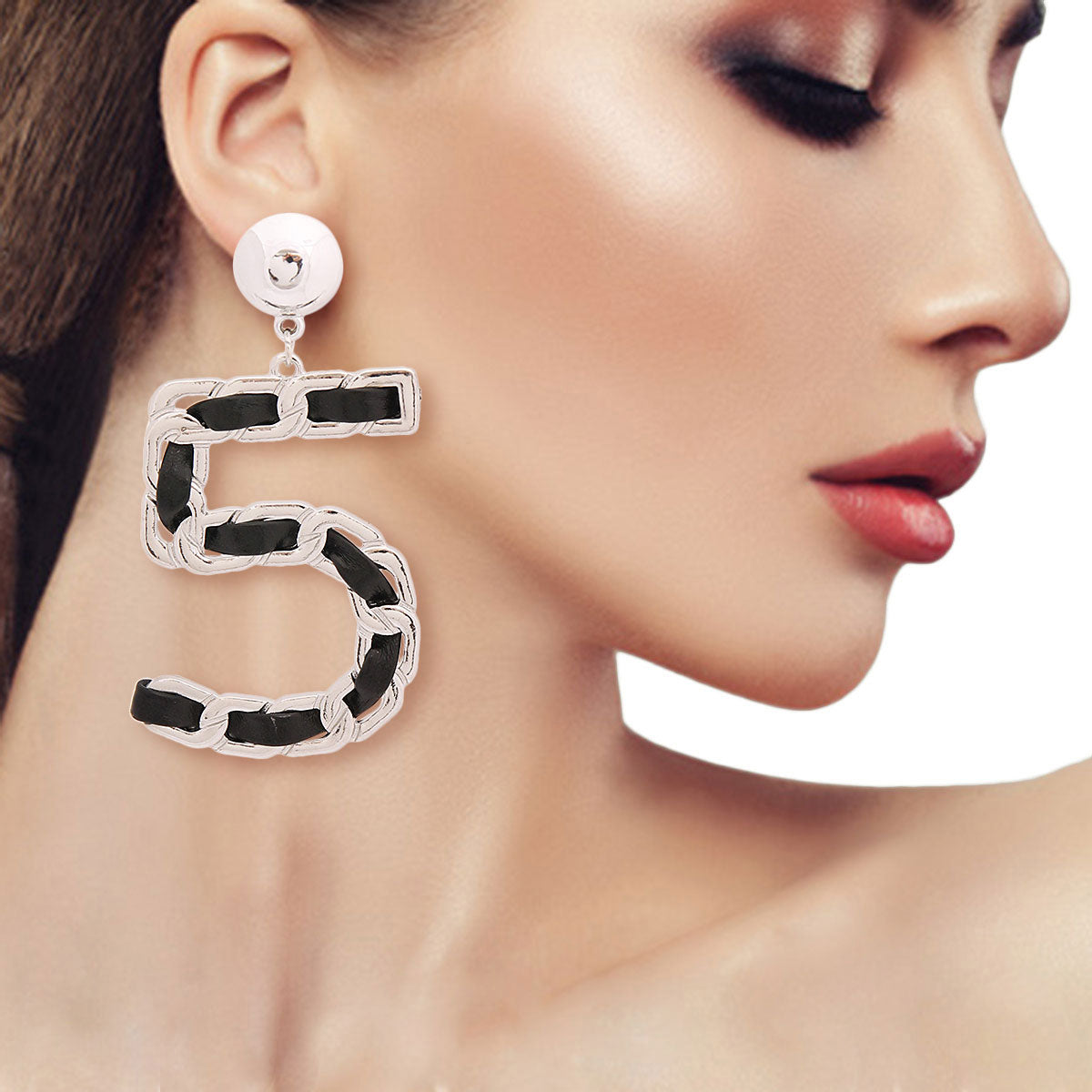 Designer Inspired High Quality Silver Metal Drop Earrings Featuring No 5 Woven with Black Vegan Leather. Earrings measure 1.65 inches wide