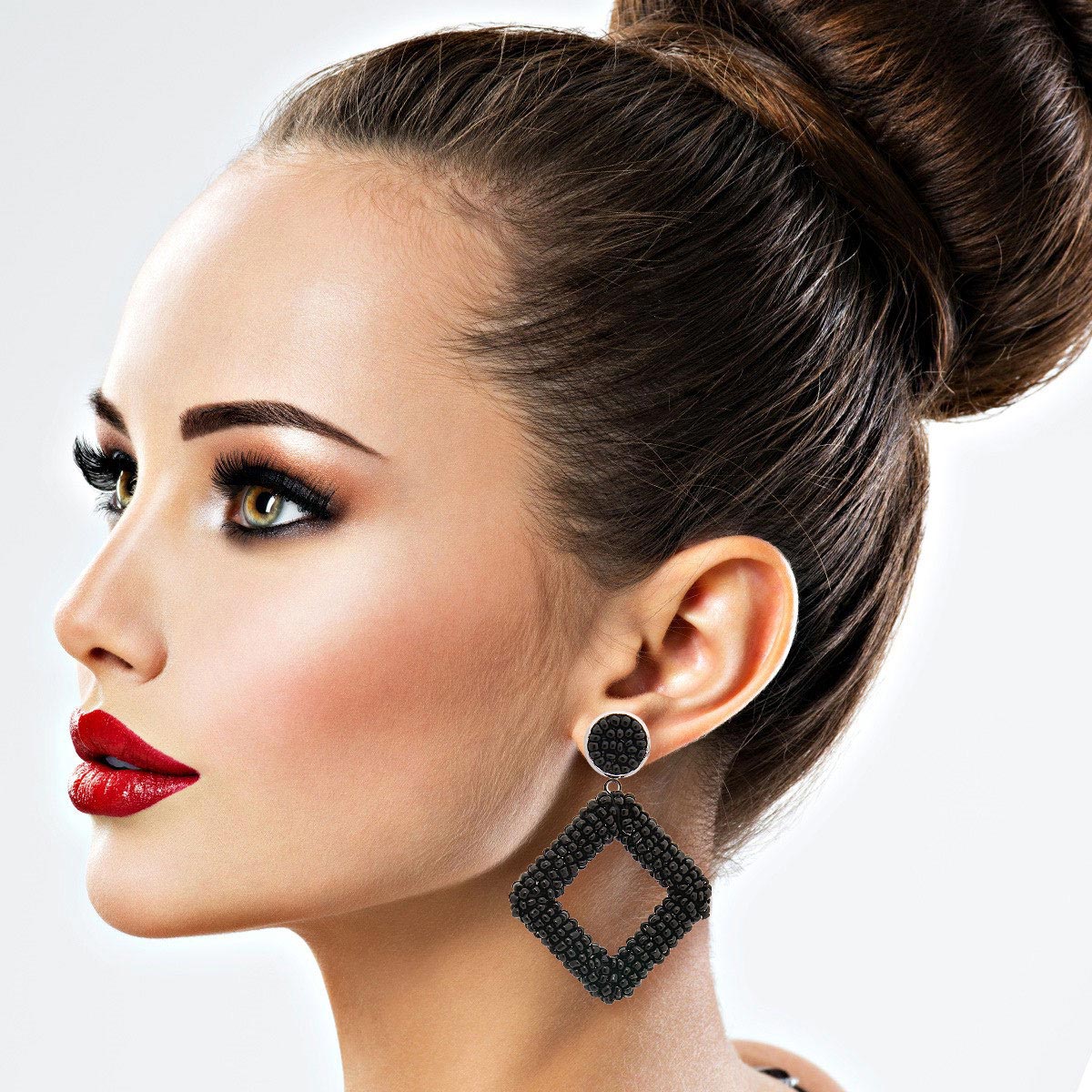 Black Seed Bead Post Earrings Featuring Diamond Shape Drop Detail. Earrings measure 1.75 inches wide