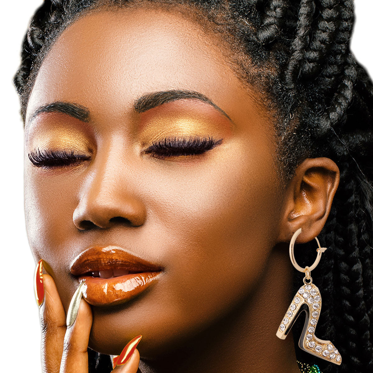 Gold Metal Hoop Earrings Featuring Bling Boutique High Heel Clear Rhinestone Charm Detail. High Heel Charm measures 1.5 inches wide