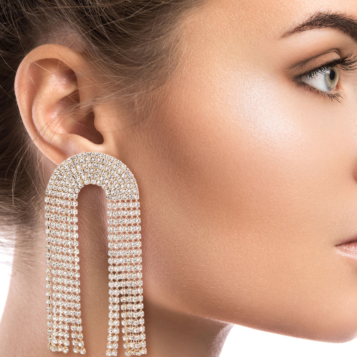 Gold Metal Arch Drop Earrings Featuring Crystal Rhinestone Fringe. Earrings measure 1.65 inches wide