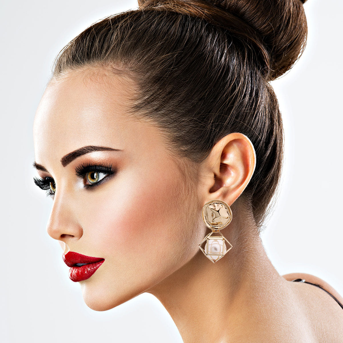 Gold Hammered Metal Earrings Featuring Caged Cream Pearl Drop Detail. Earrings measure 1 inch wide