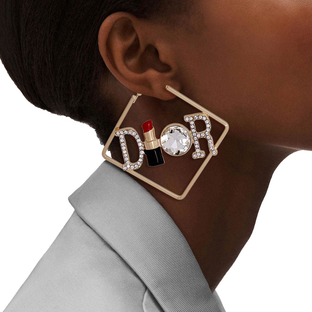 Gold Metal Diamond Shape Hoops Featuring Designer Rhinestone Lettering and Red Lipstick Detail. Earrings measure 2.75 inches wide