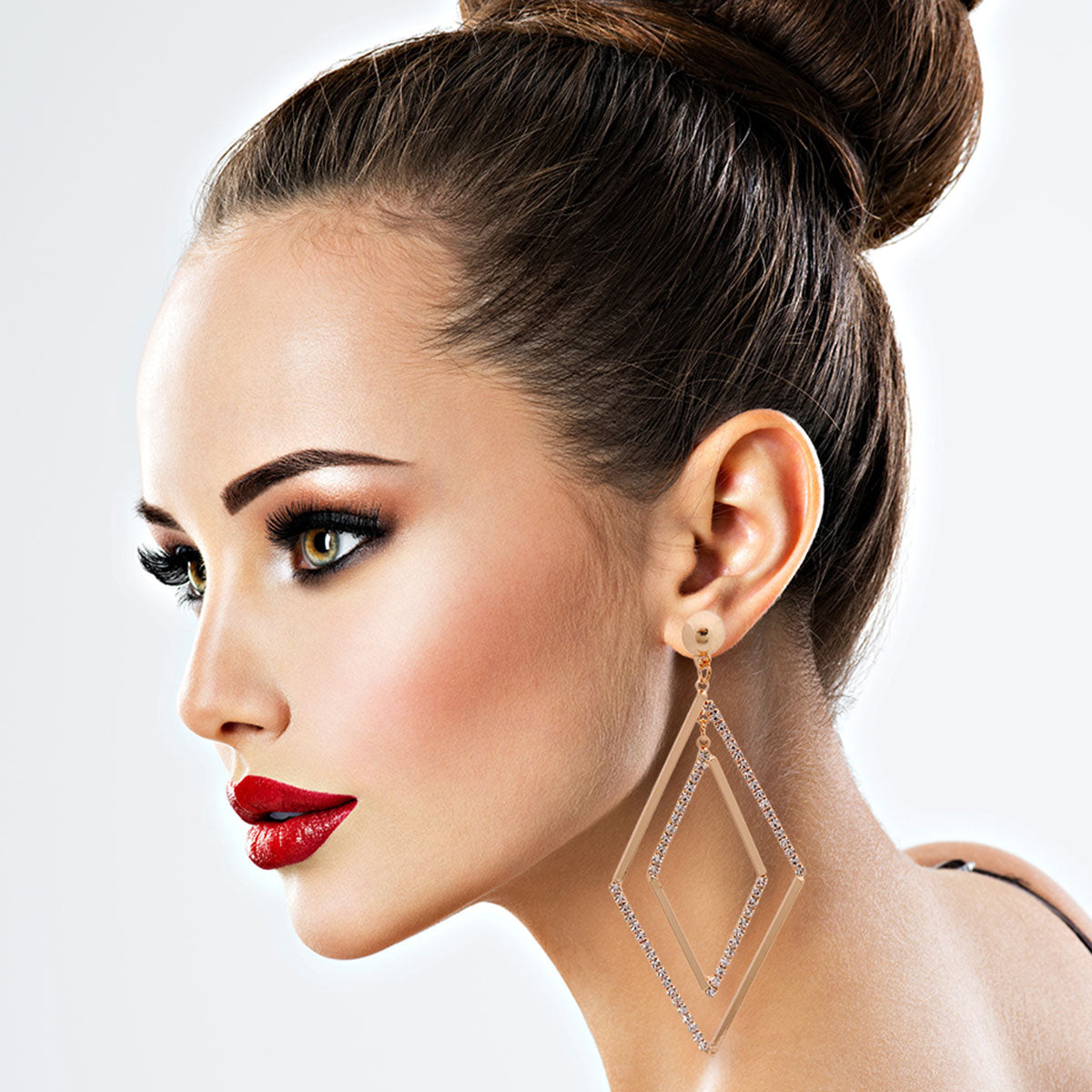 Gold Metal Double Diamond Drop Earrings Featuring Rhinestone Detailing. Earrings measure 1.65 inches wide