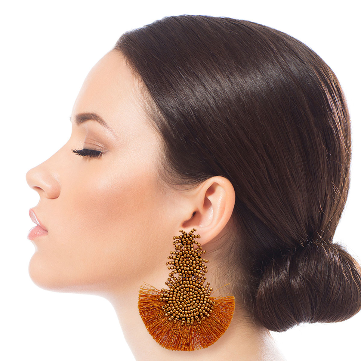Gold Seed Bead Graduated Trio Circle Drop Earrings Featuring Silk Fan Tassel Detail. Felt Backing. Earrings measure 2.75 inches wide
