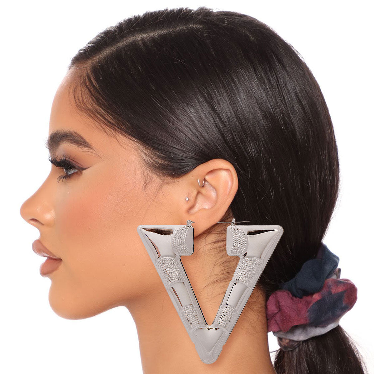 Silver Hollow Textured Metal Triangle Hoop Earrings. Earrings measure 3.5 inches wide. Bamboo Style Hoops