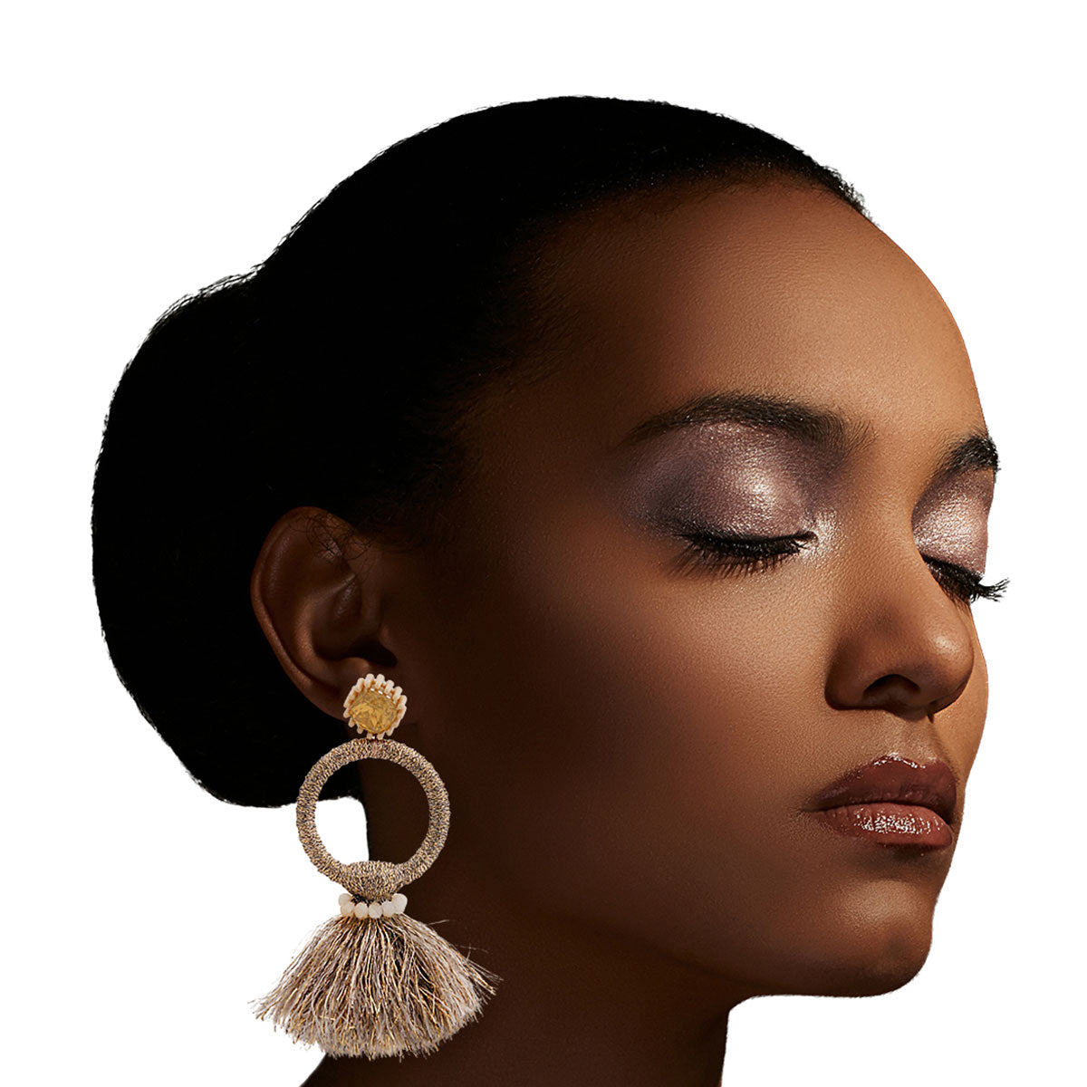 Metallic Brown Thread Ring and Tassel Drop Earrings wtih Bead Detailing. Earrings measure 1.5 inches wide