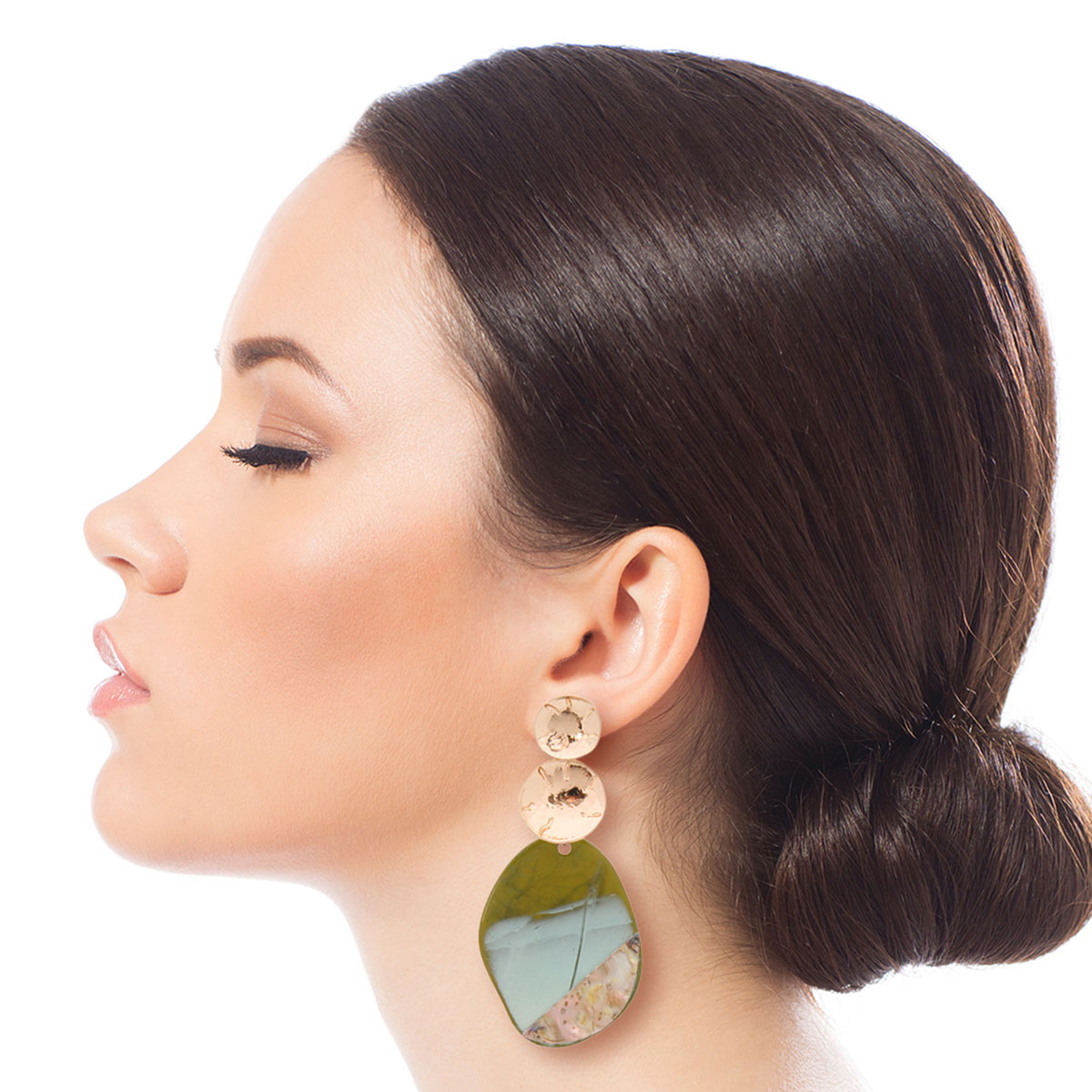 Textured Gold Metal Disc Drop Earrings Featuring Light and Dark Olive Green Acrylic and Abalone Shell Oval Detail. Earrings measure 1.5 inches wide. Allow for Natural Color Variations