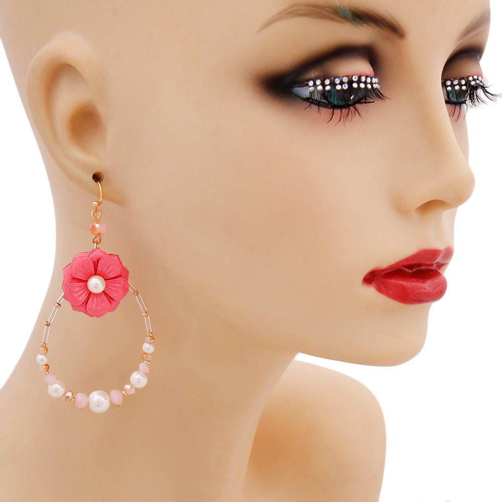 Pink Flower Teardrop Earrings with Pearl and Bead Detail
