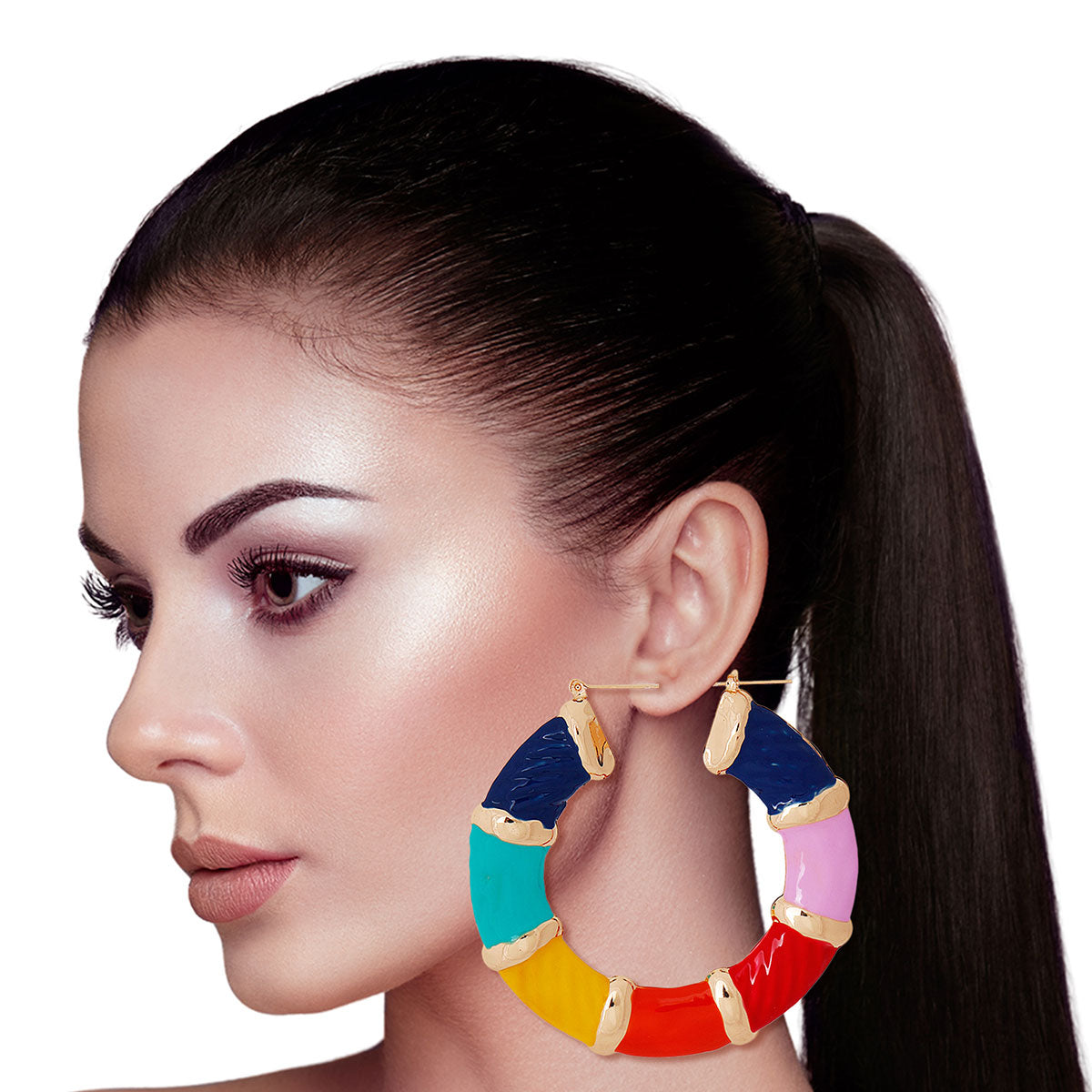 Gold Metal with Rainbow Epoxy Wide Hollow Bamboo Hoop Earrings