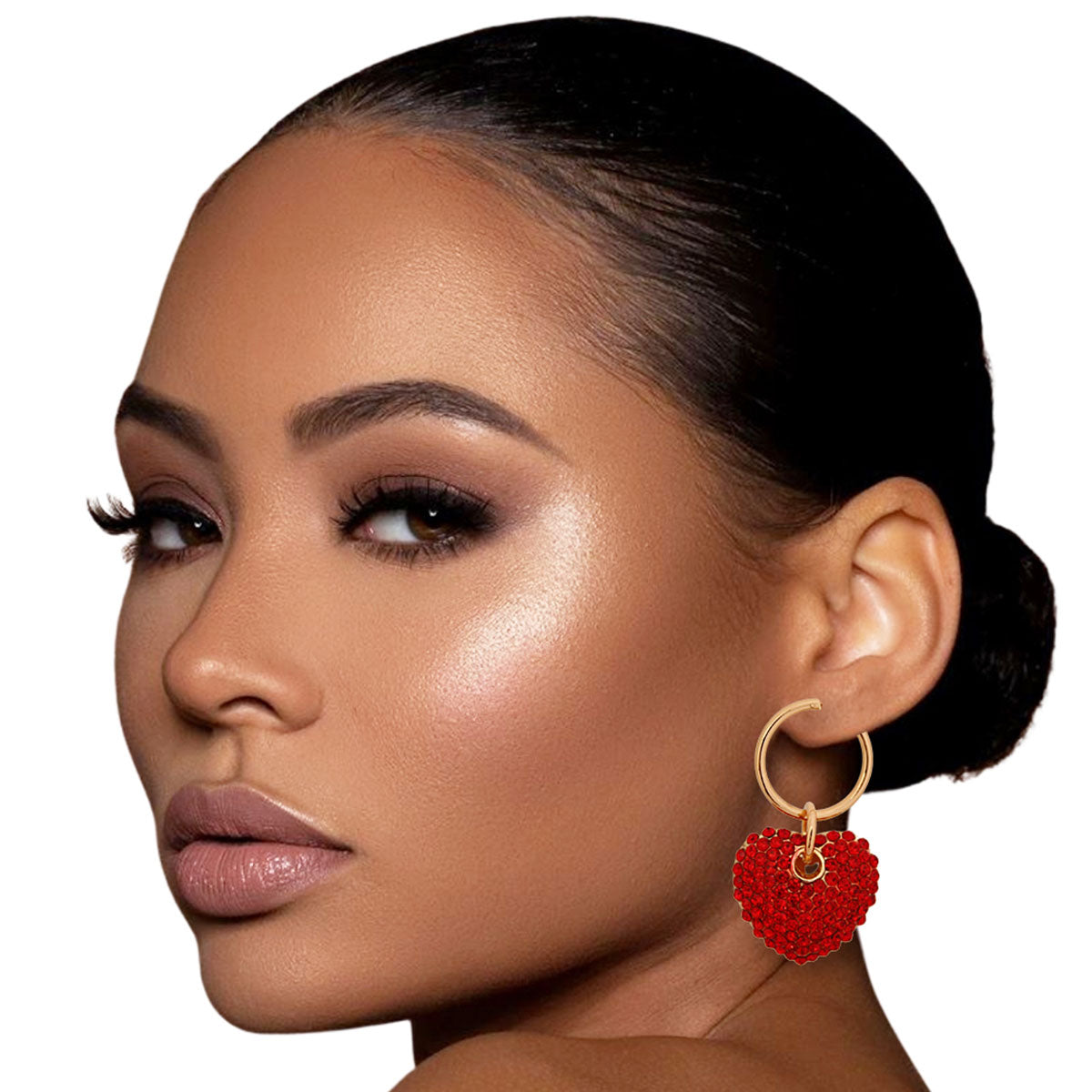 Gold Metal Baby Hoop Earrings Featuring Red Rhinestone Drop Heart Detail. Earrings measure 1.15 inches wide