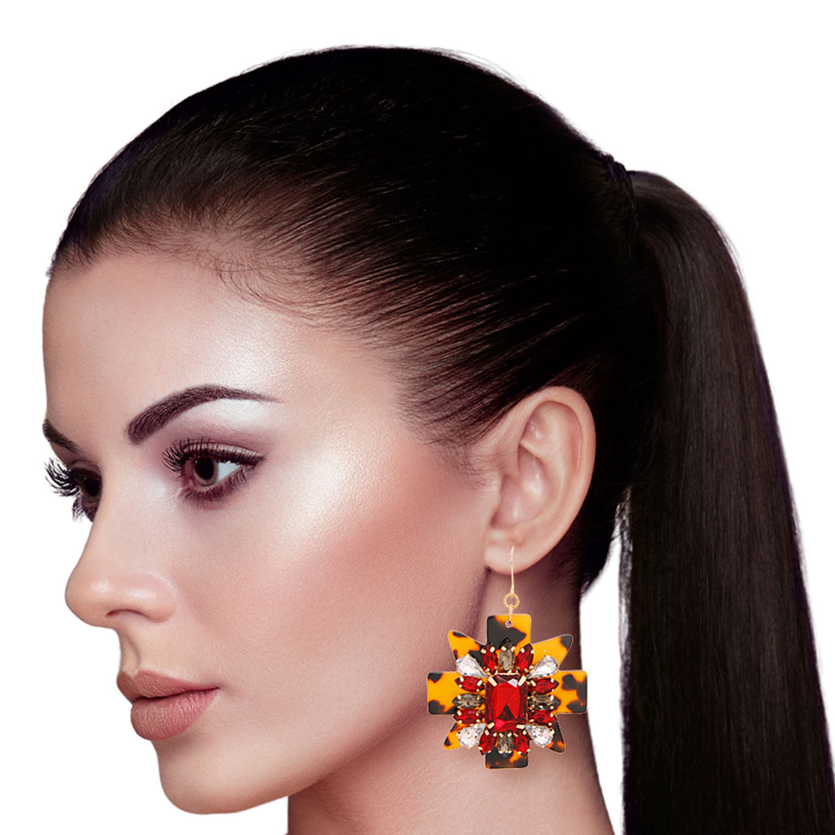 Tortoiseshell Acrylic Sunburst Shape Drop Earrings Featuring Red and Clear Crystal Detailing. Earrings measure 2.15 inches wide