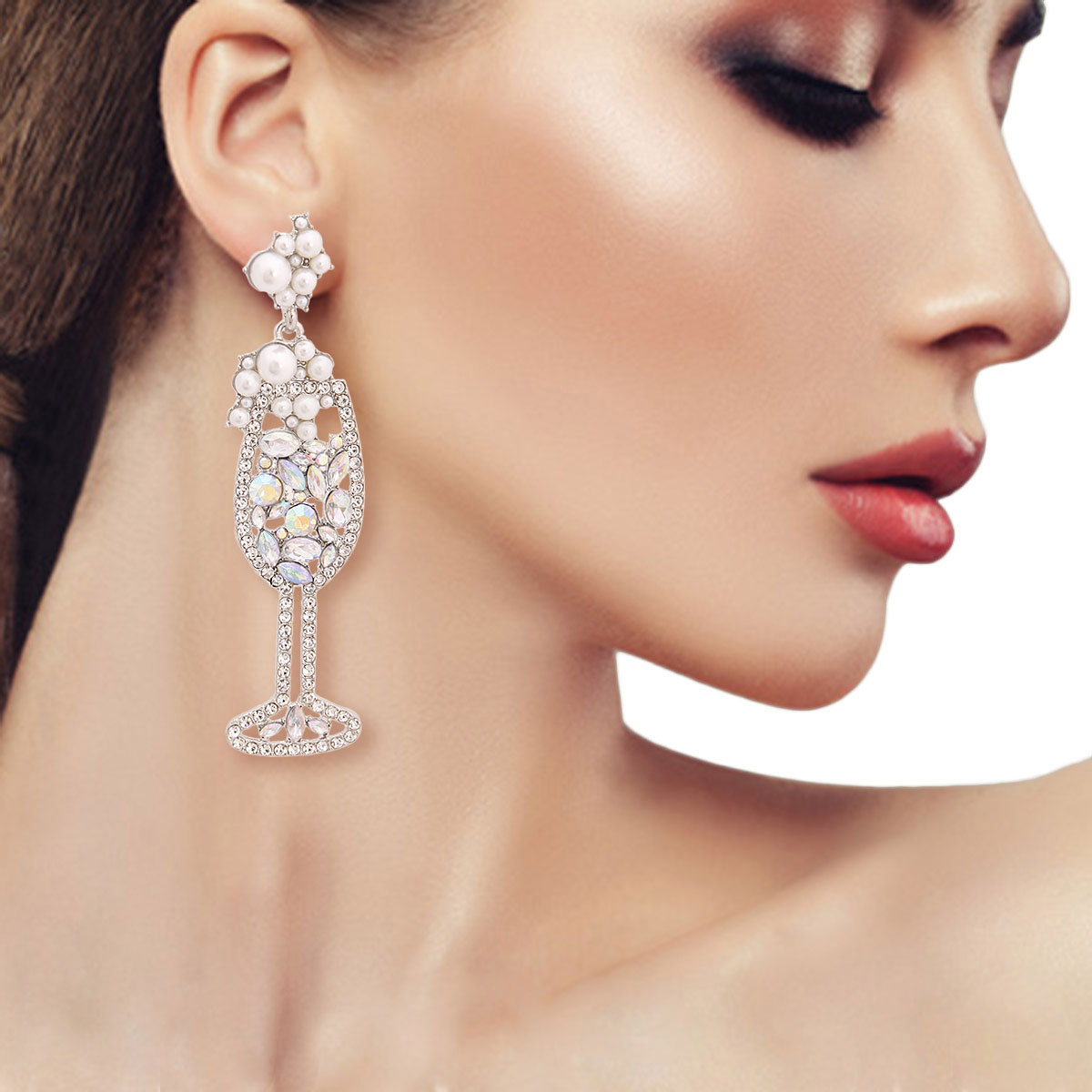 High Quality Silver Metal and Pave Rhinestone Champagne Flute Drop Earrings Featuring Aurora Borealis Crystal and White Pearl Bubble Detailing. Earrings measure .85 inches wide