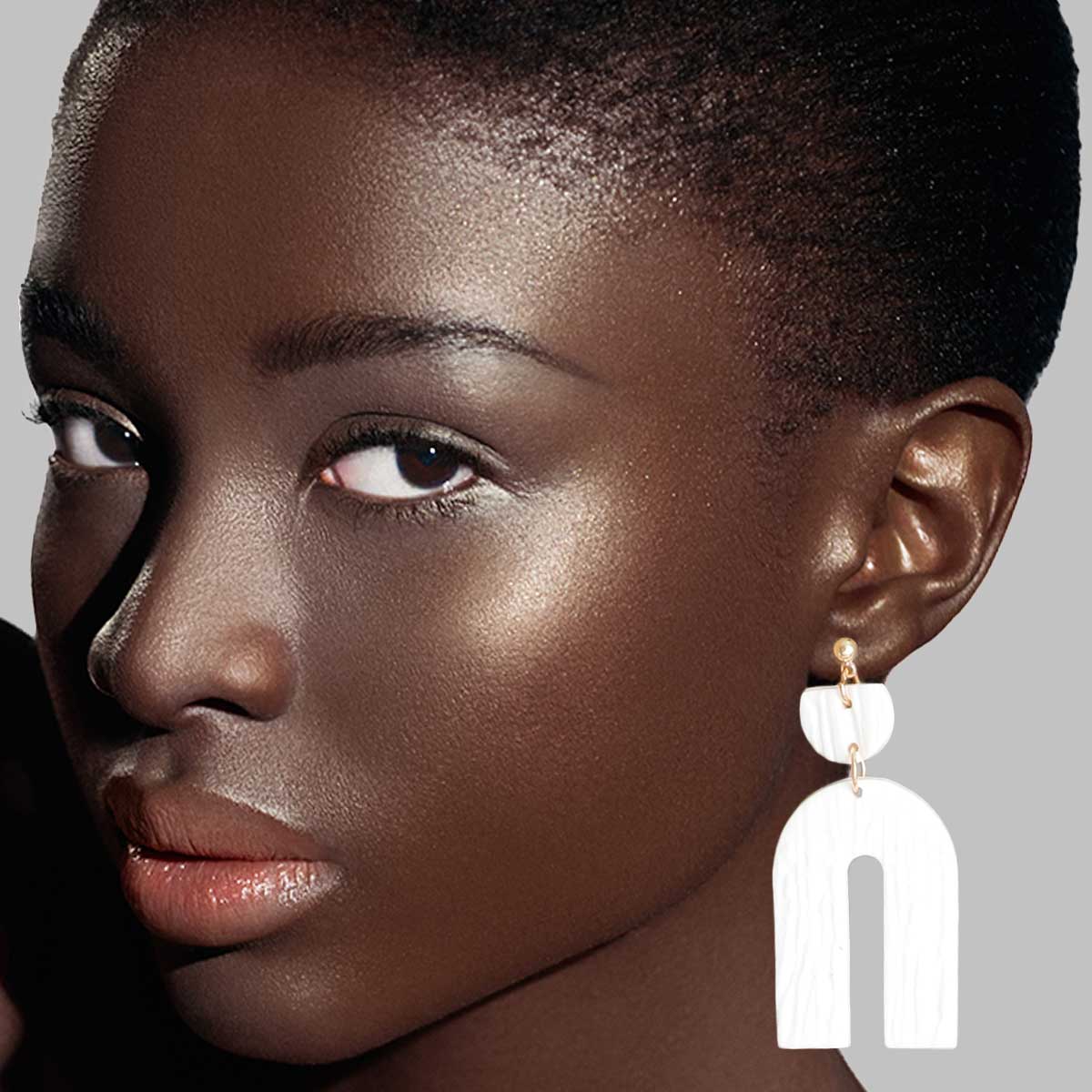 Gold Metal Fish Hook Bridal Earrings Featuring White Clay Arch Drop with Striped Texture Stamp Detail. Earrings measure 1.15 inches wide.