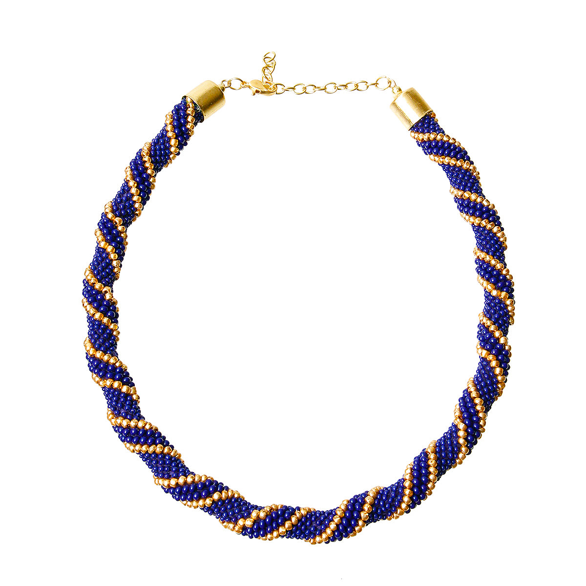Zulu Maasai Styled Crochet Rope Necklace with Gold and Blue Beading Featuring Twisted Gold Bead Detail. Handcrafted. Fair Trade. Exclusive