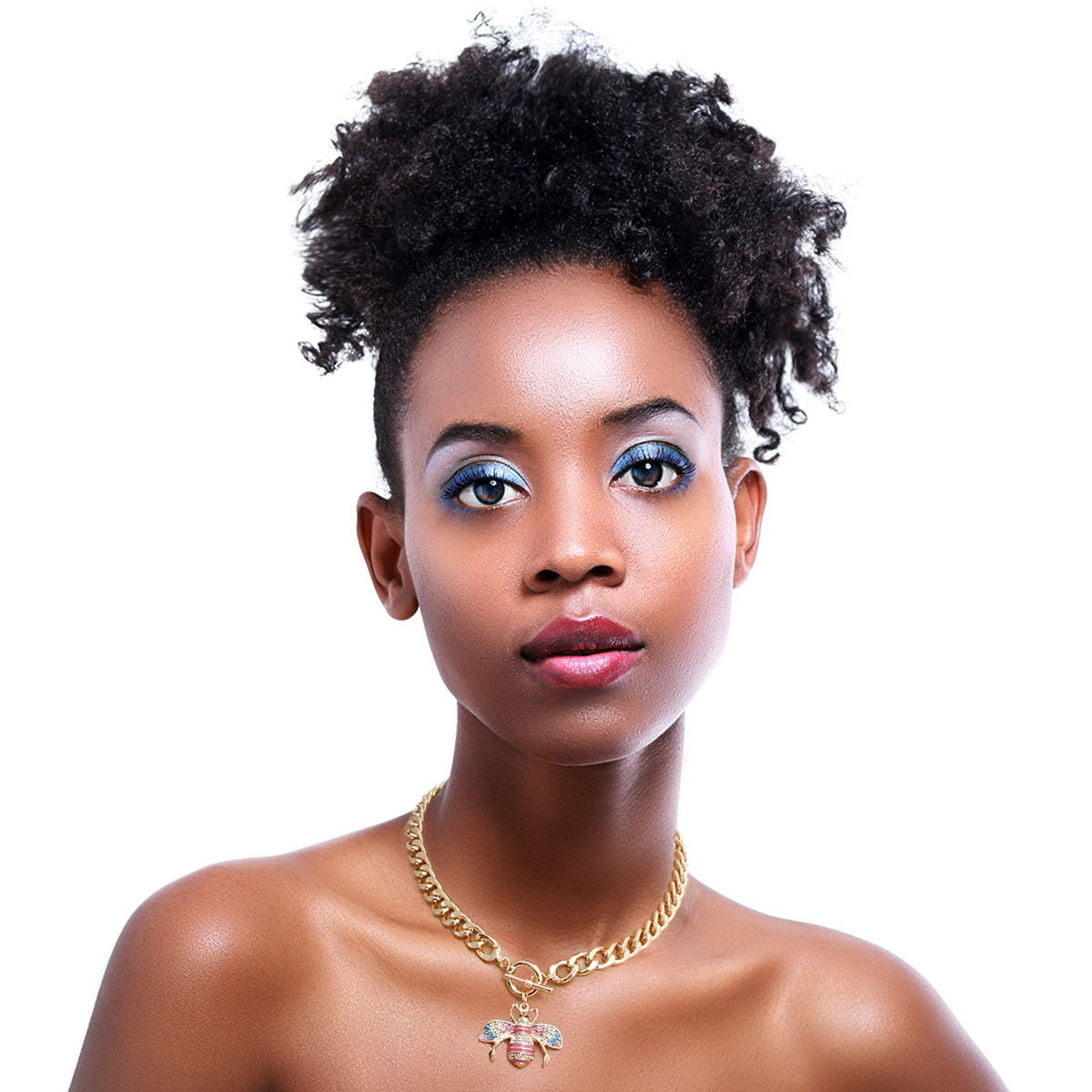 Designer Style Gold Metal Chain Toggle Necklace Featuring Rainbow Rhinestone Striped Bee Charm Pendant. Bee measures 1.5 inches wide