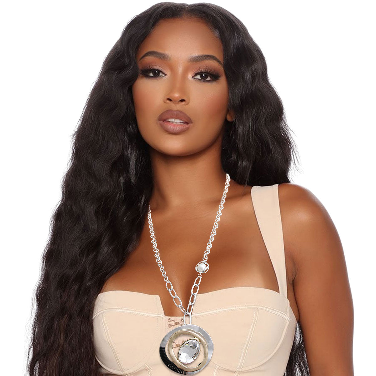 Long Silver Metal Chain Necklace Set Featuring Pearl and Mixed Metal Crystal Pendant Detailing. Pendant measures 2.5 inches