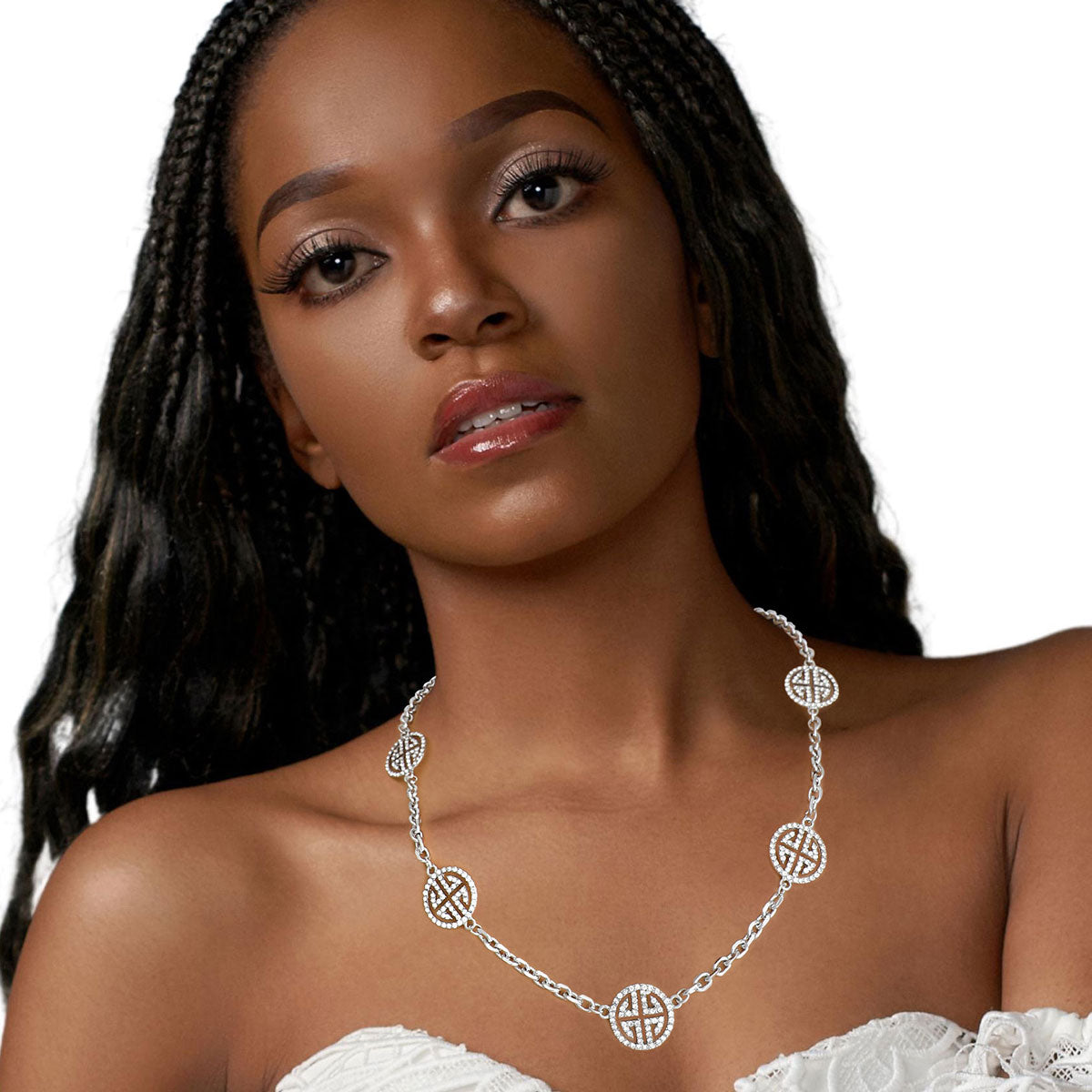 Silver Metal Cable Chain Necklace Featuring Designer Inspired Round Greek Key Station Details. Greek Key Details measure .75 inches each.