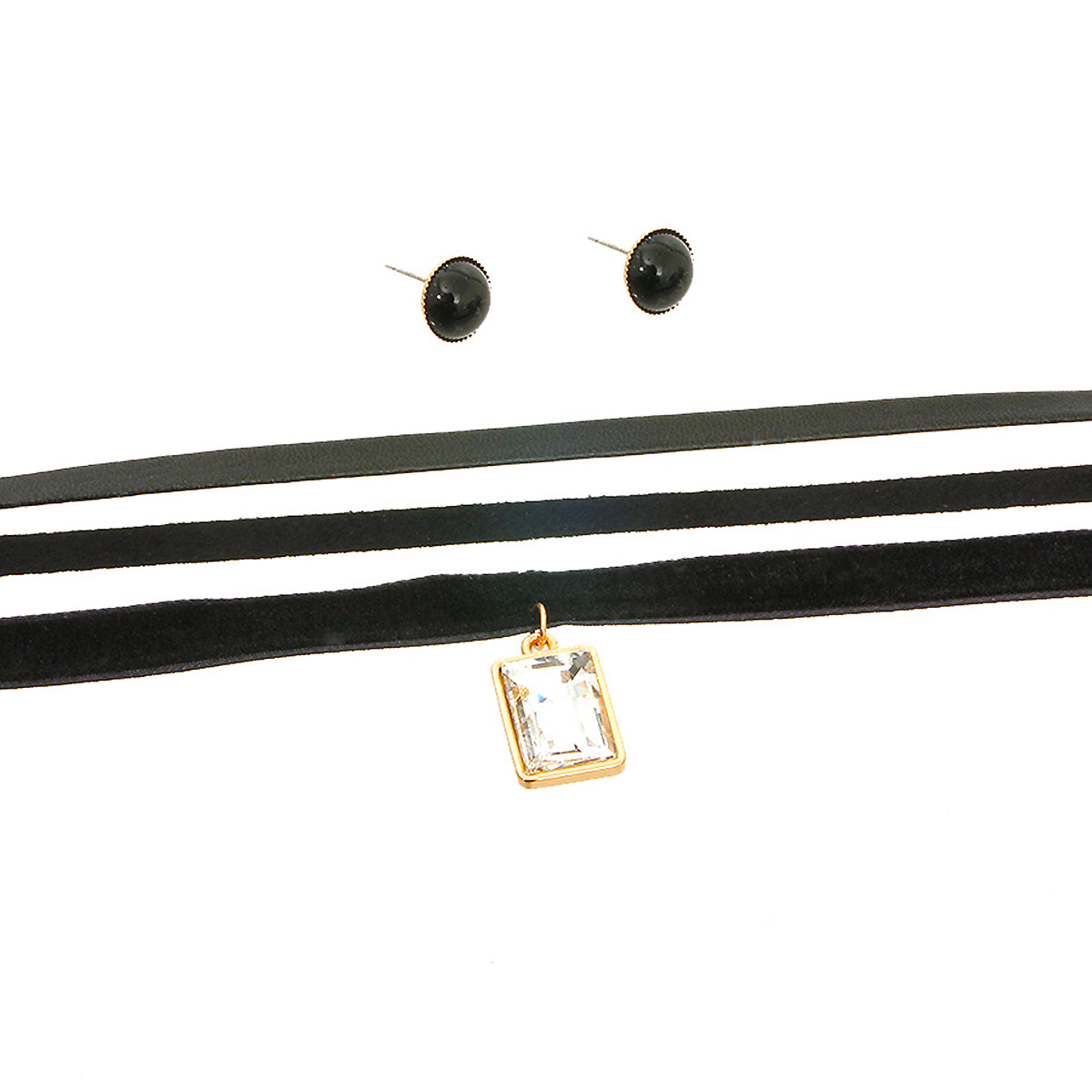 Black three different types of choker set with clear dangling stone. Lobster clasp closure. Three closures are separate