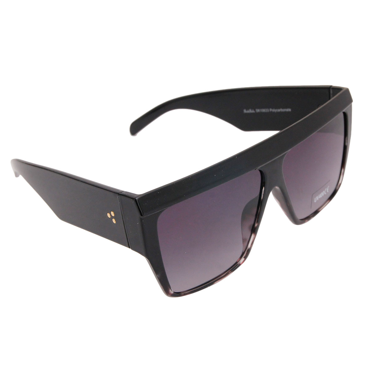 Plastic Black and Gray Square Shape Oversized Sunglasses Featuring Wide Side Arm. Sunglasses measure 6 inches across and 2.5 inches long. UV 400 Protection. Blocks 100% UVA & UVB