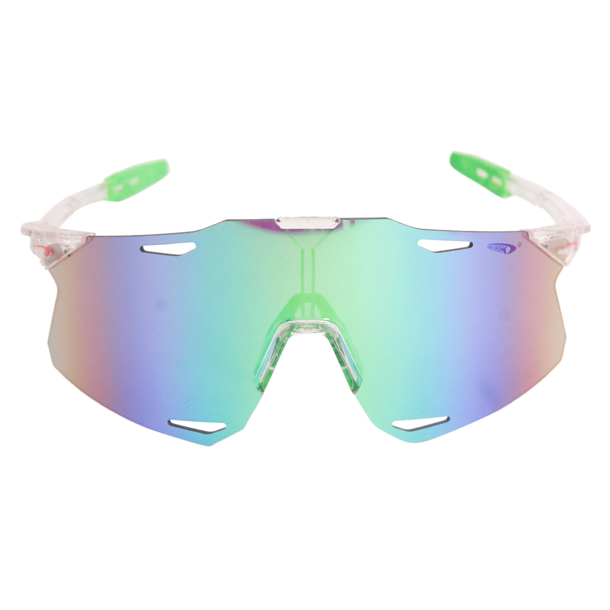 Green Tint Mirror Lens Plastic Sport Visor Sunglasses Featuring Green Side Arms. Sunglasses measure 7 inches across and 2.75 inches long. UV 400 Protection. Blocks 100% UVA & UVB