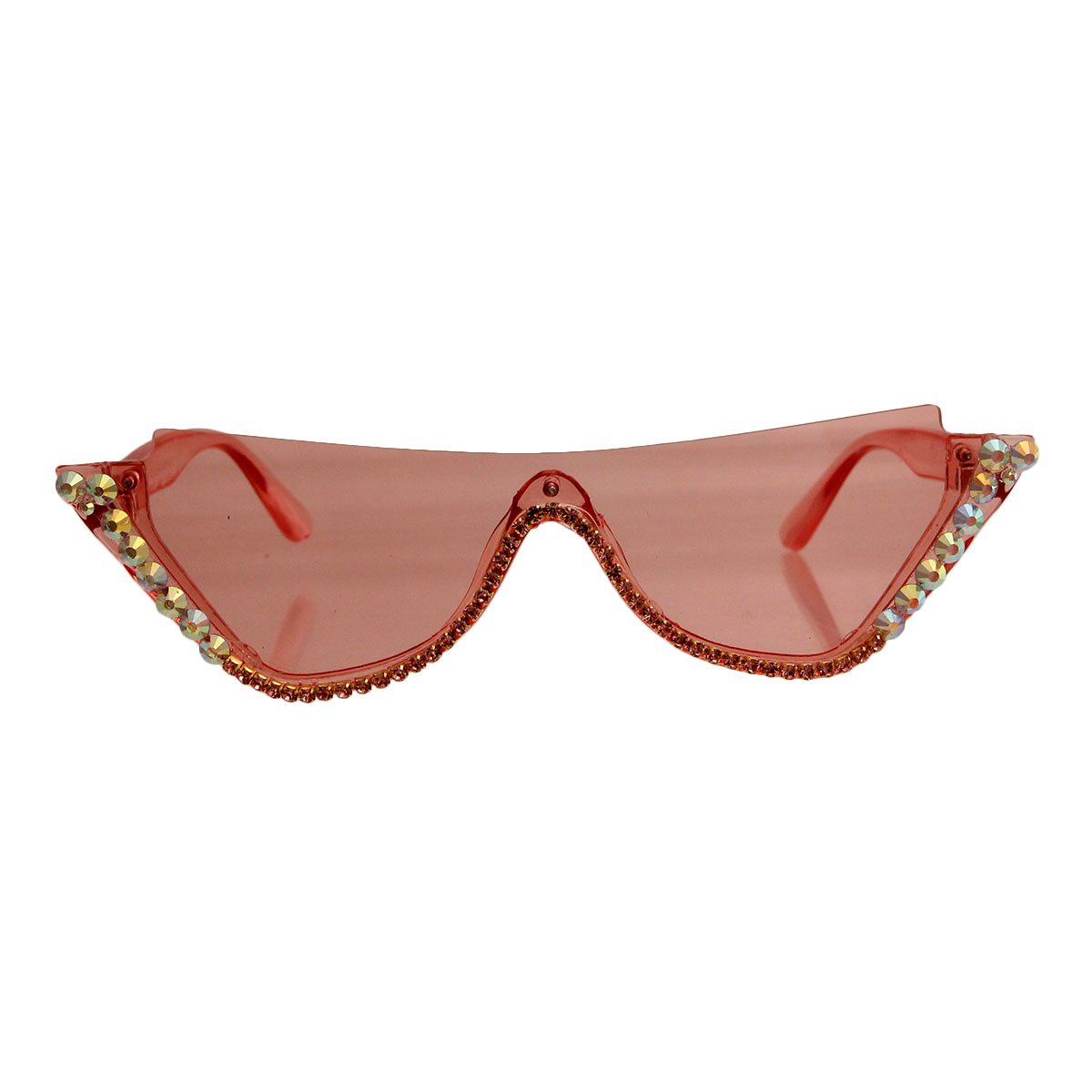 Retro Pink Cat Eye Sunglasses Featuring Rimless Top with Bottom Crystal and Rhinestone Trim Detailing. Sunglasses measure 6 inches across and 1.5 inches long. UV 400 Protection. Blocks 100% UVA & UVB