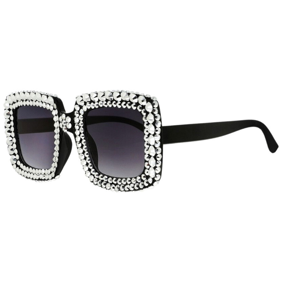 Sparkly Oversized Black Square Plastic Sunglasses Featuring Silver Crystal Rhinestone Detailing. Sunglasses measure 5.75 inches across and 2.85 inches long. Drawstring Sunglasses Pouch Included. UV 400 Protection. Blocks 100% UVA & UVB