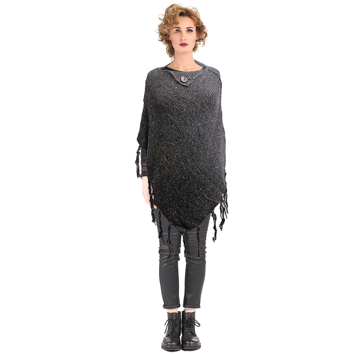 Black and Multi Color Knit Winter Poncho Wrap Featuring Button Collar Detail and Fringe Tassel Edging. 100% Acrylic. One size Fits All. Poncho measures 27 inches from neckline to point. Fringe measures 7.5 inches