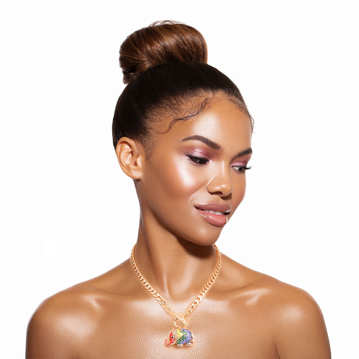 Gold Metal Chain Toggle Necklace Featuring Rainbow Rhinestone Elephant Charm Detail. Elephant measures 1.5 inches