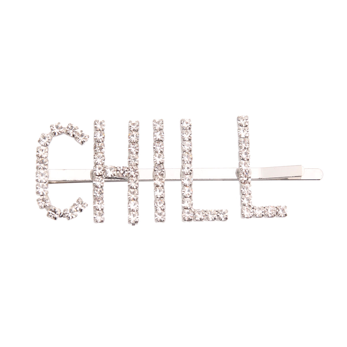 Silver Metal Hair Bobby Pin Featuring Crystal Rhinestone CHILL Detailing. Letters measure 1.15 inches tall
