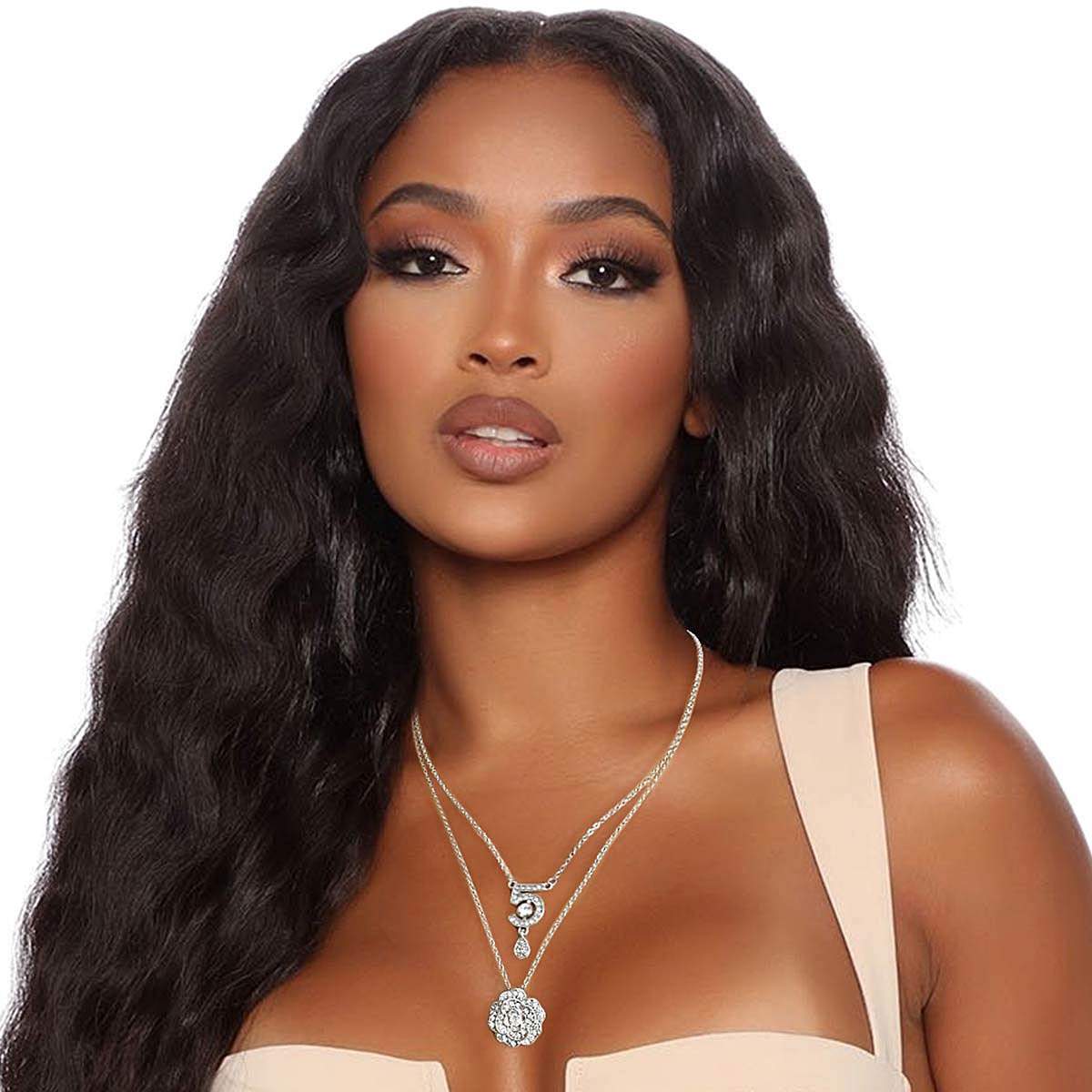 Silver Metal Double Strand Layered Necklace Set Featuring Designer Inspired Rhinestone 5 and Flower Charm Pendants. Flower Pendant measures .75 inches. Necklace measures 16.5" to 18".
